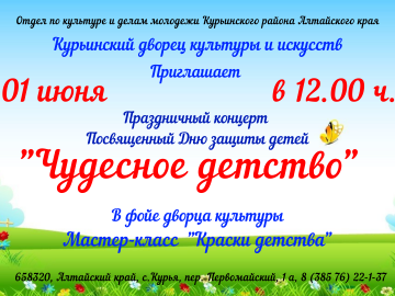 Дорогие друзья! Приглашаем Вас отпраздновать День защиты детей вместе с нами! Детские творческие коллективы дворца культуры и искусств подготовили большую праздничную программу. ...