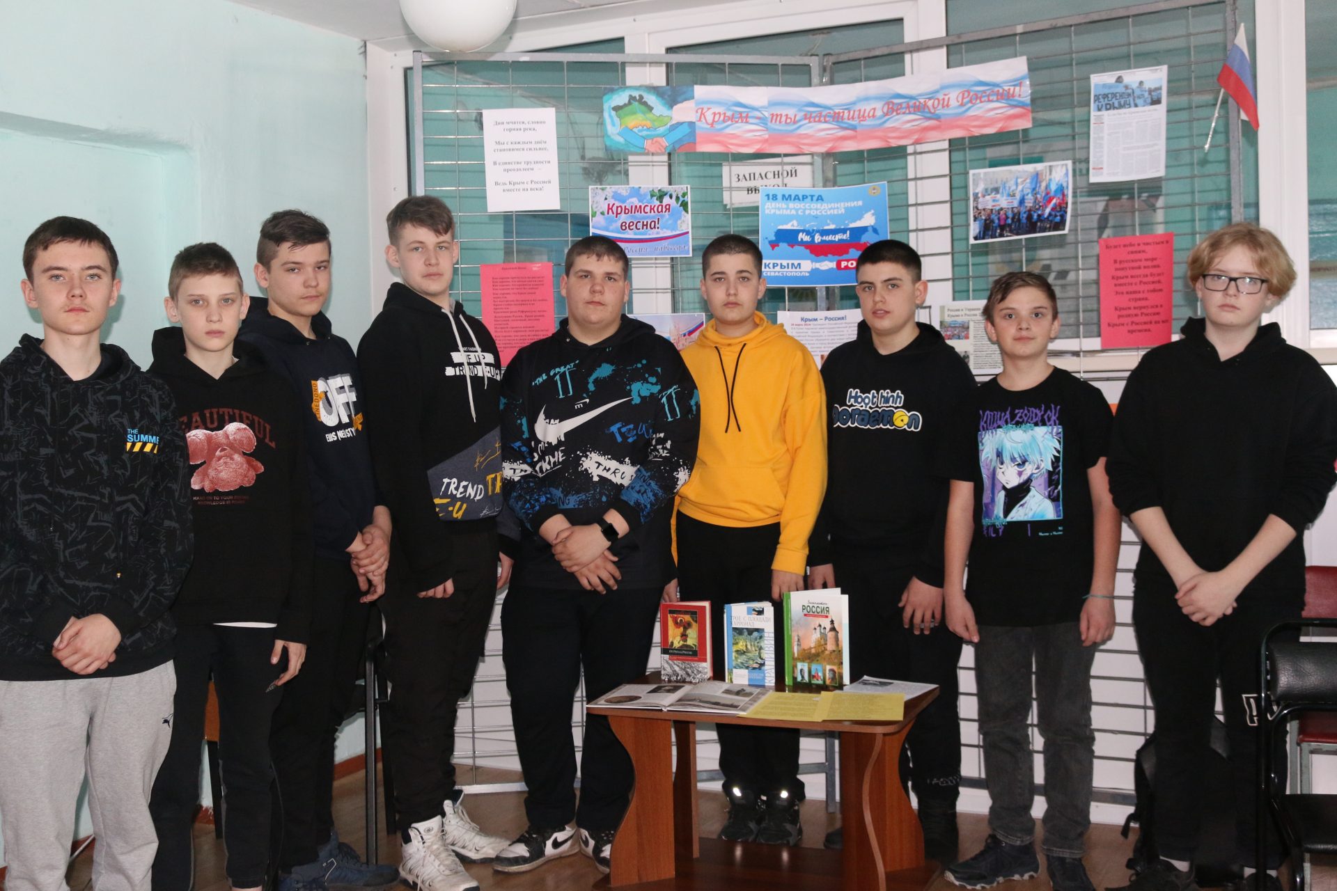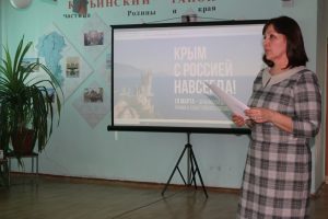 К мероприятию была оформлена выставка – панорама «Крым – ты частица великой России», на которой представлены книги и периодические издания из фонда библиотеки, рассказывающие об истории Крыма, о том, как происходило воссоединение с Россией.