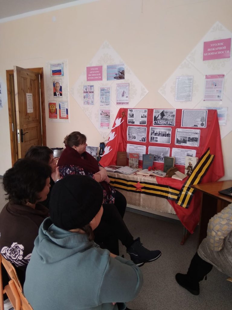 2 февраля исполняется 82 года со дня освобождения города – героя Волгоград в Сталинградской битве. Великая битва на Волге навсегда вошла в летопись ратных побед нашей страны. К этой дате в Ивановской поселенческой библиотеке была подготовлена книжная выставка – память «Горячий снег Сталинграда», участниками которой стали члены клуба «Берегиня». Библиотекарь рассказала о тех далёких страшных событиях 17 июля 1942 года, о доме Павлова, в котором держали оборону наши солдаты 58 дней, о знаменитых командующих, как Василевский, Чуйков, Еремеев, о великом народном мужестве и единстве народа. Для участников был проведён обзор художественных книг о Сталинграде и даны рекомендации для прочтения таких книг, как «В окопах Сталинграда» В. Некрасова, «От Сталинграда до Берлина» В. И. Чуйков, «Горячий снег» Ю. В. Бондарев. А чтобы воочию увидеть, как разворачивались боевые действия, участникам была показана кинохроника. Эти кадры лучше всяких слов говорят о цене Победы на Волге.