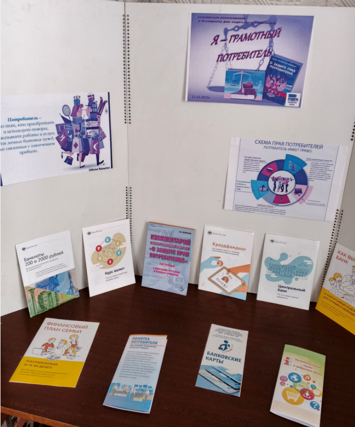 В читальном зале, была оформлена просветительская выставка «Я – грамотный потребитель», на которой была представлена литература о защите прав потребителей: Федеральный закон о защите прав потребителей, комментарии к закону РФ «О защите прав потребителей», издания о том, как потребителю отстоять свои права в различных ситуациях: услуги ЖКХ, общепита, транспорта, турпоездки, покупка товара, услуги по страхованию.