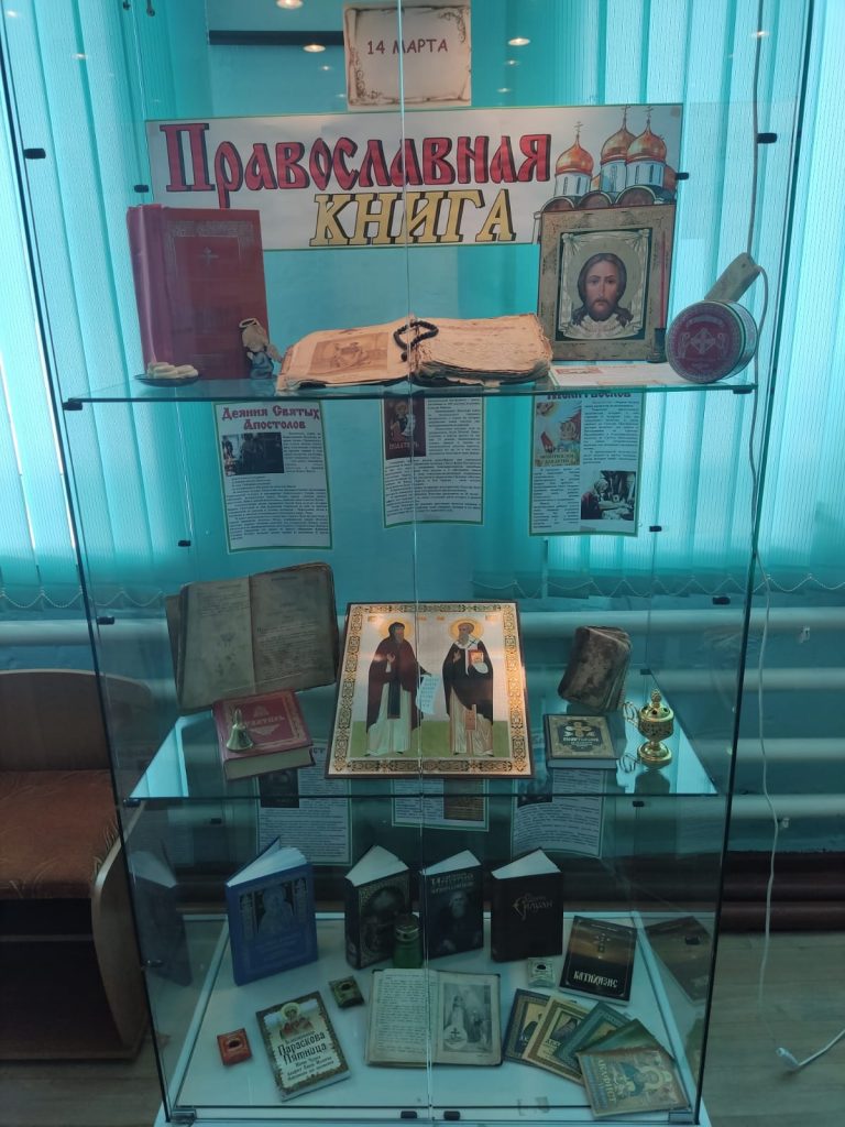 Ежегодно, начиная с 2010 года, в России 14 марта  отмечают День православной книги. Накануне этого праздника в Курьинской центральной детской  библиотеке была оформлена выставка – витрина  «Православная книга». Православная литература – особый вид литературы в необъятном книжном пространстве. До святых равноапостольных Кирилла и Мефодия все священные книги, были написаны только на древнееврейском, греческом и латинском языках. Первые славянские книги были рукописными. Создавали их в тиши святых обителей монахи. Они старательно выписывали каждую буковку. Заглавные буквы писали красными чернилами. Книги переплетали в кожу и богато украшали золотом, серебром и драгоценными камнями. Православная книга — это книга, пронизанная заповедями, это кладезь духовной мудрости!  На выставке представлены:  Библия – Книга книг, Апостол, Псалтирь, Православный молитвослов, Часослов, Катехизис, Жития святых, Акафисты Богородице и святым – Матроне Московской, Луке Крымскому, Иоанну Кронштадскому, Тихону Задонскому, книга о святителе Игнатии Брянчанинове, книга воспоминаний об афонском старце Силуане. Жемчужиной выставки являются антикварные экземпляры богослужебных книг, принадлежащих семье Отто, бесценная семейная реликвия . Это истинные памятники духовной культуры.