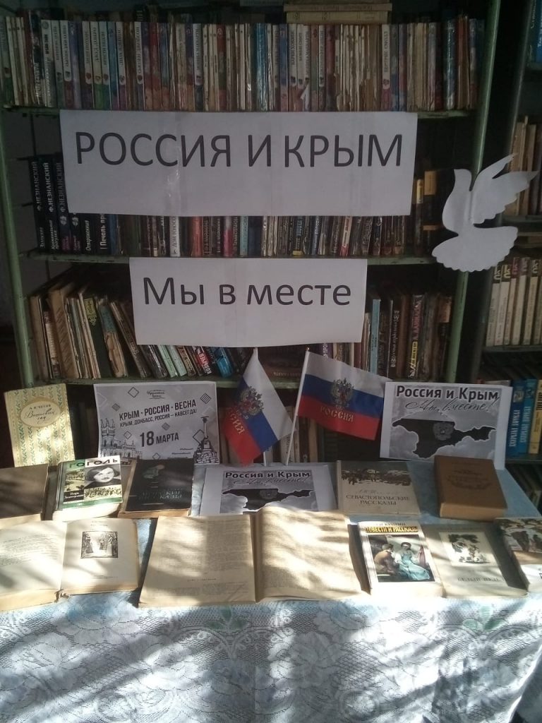 18 марта Российская федерация отмечает годовщину исторического события , значение которого не возможно переоценить. 11 лет назад состоялась воссоединение Крыма и Севастополя с Россией. ” Крымская весна ” сделала то что казалось почти не возможным – она сплотила всех граждан Российской федерации. В честь этого замечательного события в Бугрышихинской поселенческой библиотеке, для читателей провели познавательный час ” Россия и Крым мы в месте “. На мероприятии участники узнали информацию об исторических событиях , ставшими причиной воссоединения Крыма с Россией, о международном договоре , о принятии Крыма и Севастополя в состав России . И об итогах проведения в марте 2014 года референдума в Крыму. Так же для читателей была оформлена книжная выставка . На выставке можно познакомится с произведениями писателей , для которых в разные времена полуостров Крым , стал источником многих великолепных произведений . В Крыму А. П. Чехов написал ” Даму с собачкой ” , А.С. Пушкин ” Бахчисарайский фонтан ” , Н. В. Гоголь ” Тарас Бульба ” , описал быт и нравы крымской станицы 15 века Л. Н. Толстой ” Севастопольские рассказы” и многие др.