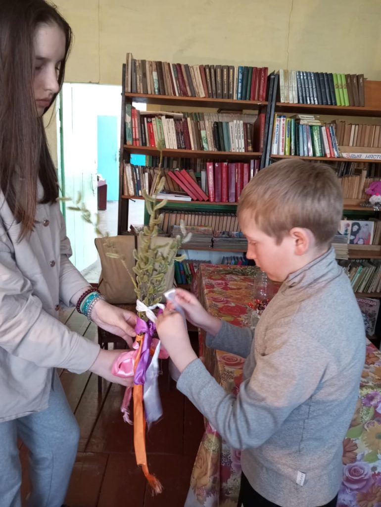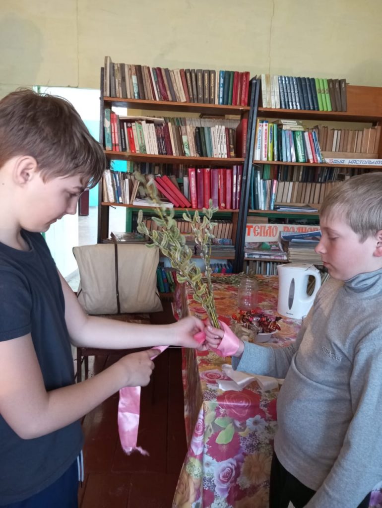В Казанцевской библиотеке прошло мероприятие “Вербное воскресенье – традиции и обычаи”. Мы с ребятами поговорили об истории праздника. Верба – символ “Вербного воскресенья”, ее освещают и хранят весь год. Освящённая верба считается сильным оберегом от болезней, пожара, нечистой силы и невзгод, а чтобы быть физически здоровым в давние времена на Руси одним из самых известных ритуалов был обычай слегка бить освященными ветвями родных и близких. Считалось, что это помогает «от порчи и сглаза». Мы конечно же тоже наломали веточек вербы и побили друг друга ими.