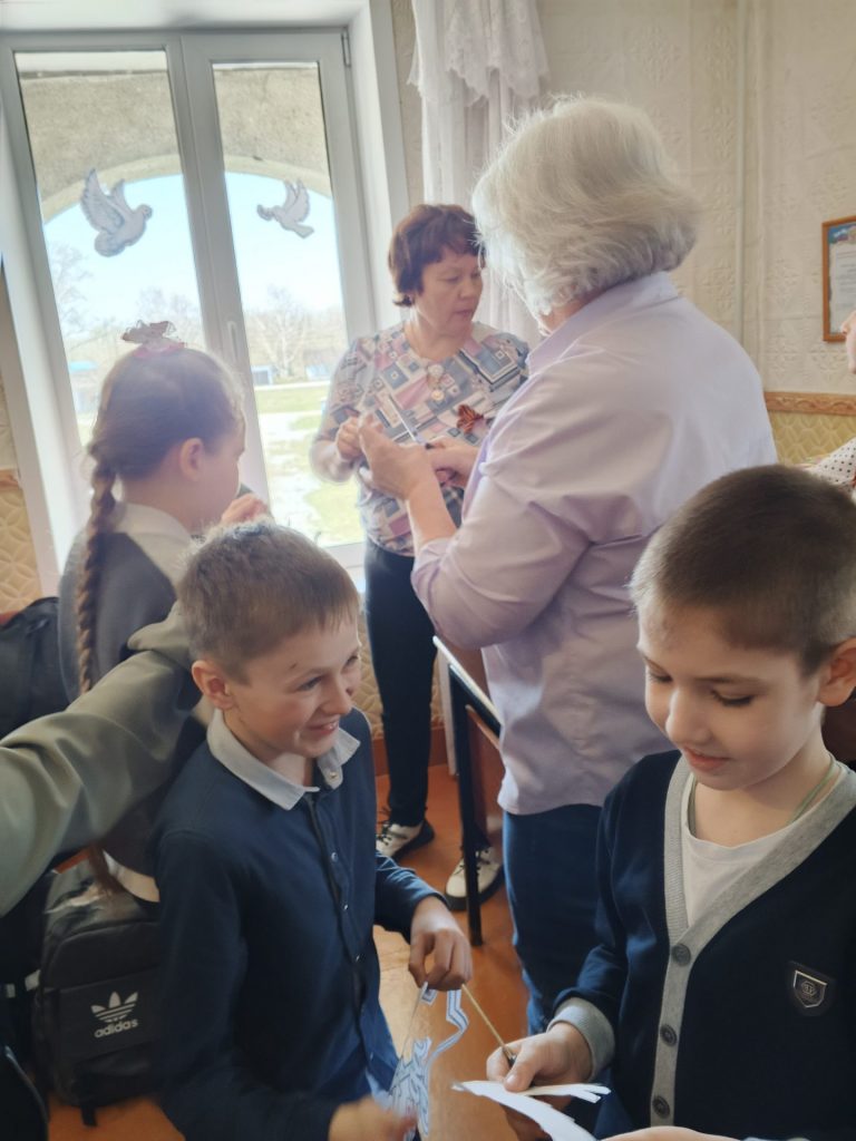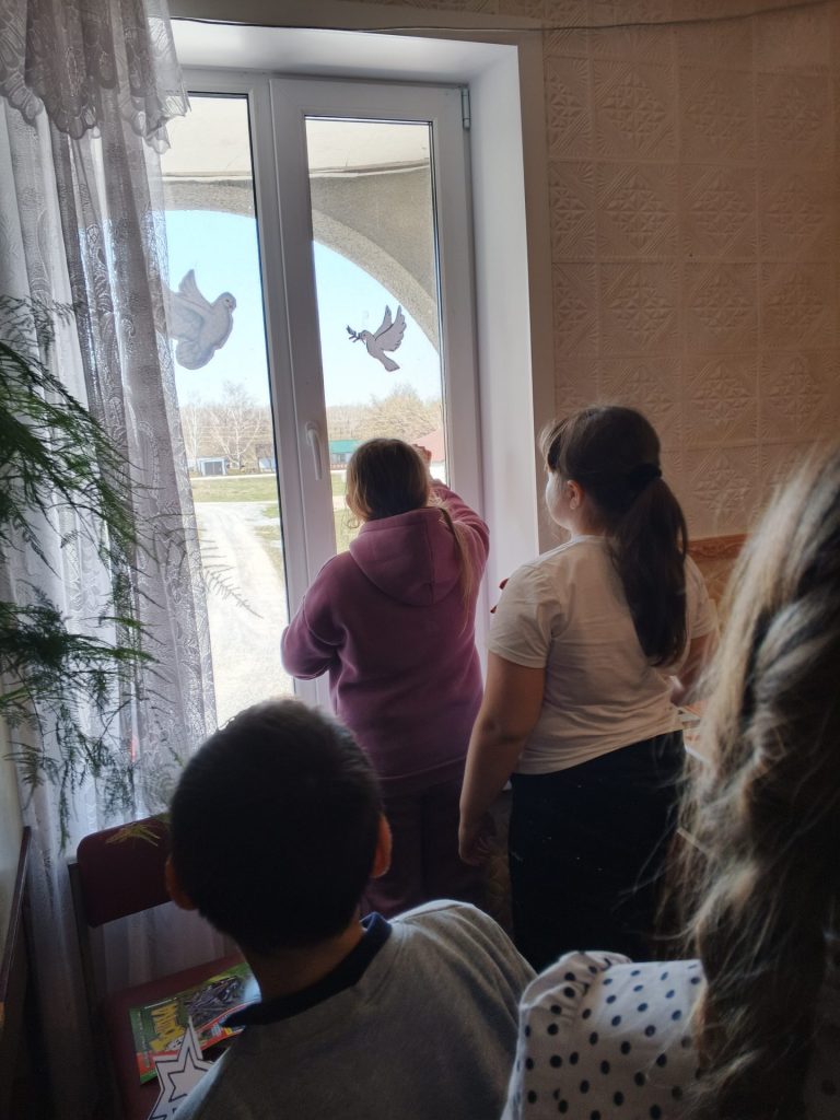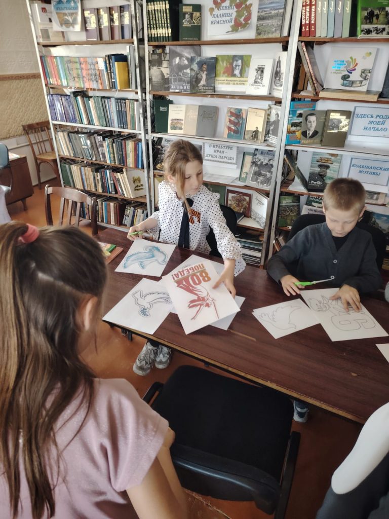 .Для младших школьников была представлена электронная презентация «Держава армией крепка». Ребята узнали об истории Российской армии, о том, кто и как защищал нашу землю, познакомились с видами и родами войск. Творческая нота прозвучала на мастер-классе «Голубь мира». Участники мероприятия создали символ надежды и согласия — белого голубя. Каждый голубь, вырезанный своими руками, стал маленьким посланием мира и добра и стал украшением ,,окон победы,, в библиотеке .