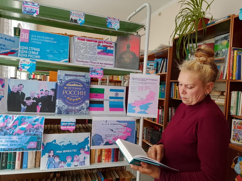 В России 30 сентября отмечается праздник, посвящённый событию огромного исторического значения. Ровно три года назад в этот день в состав Р. Ф. вернулись четыре южных региона : Донецкая и Луганская народные республики, а также Херсонская и Запорожская области. К этому важному событию в Ивановской поселенческой библиотеке прошёл час общения в формате дискуссии для участников клуба «Берегиня». Библиотекарь напомнила читателям историю вхождения новых регионов в состав России, рассказала о результатах референдума, о стремлении жителей Донбасса говорить на русском языке и проявления нацизма и фашизма против мирного населения. Также была организована выставка «Вместе с Россией», на которой был представлен книжный материал, рассказывающий о истории и культуре этих регионов, помогая прикоснуться к подвигу живущих там людей. Данное событие для людей этих территорий является возращением в нормальное правовое русло и избавление от гнёта нацистов, а для России – восстановление исторической справедливости в борьбе за правду.