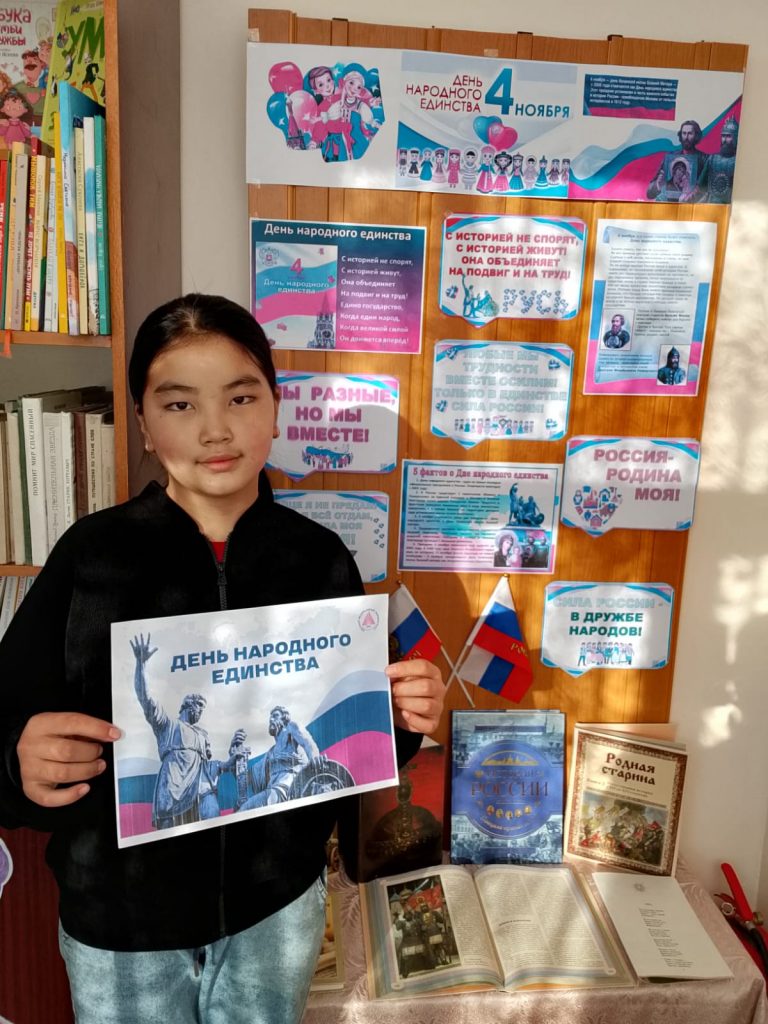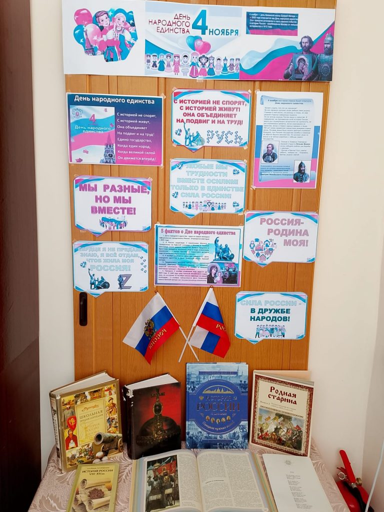 4 ноября  мы празднуем один из самых значимых праздников  в России  –  День народного единства. И хотя этот праздник считается  молодым, он берёт своё начало в далёком 17 веке в смутном, как его называли времени. Именно  тогда  в 1612 году  была продемонстрирована сила человеческого духа, сплочённости перед лицом общей опасности  Нижегородского земского ополчения, мужеству и героизму старосты  Кузьмы Минина и  воеводы Дмитрия  Пожарского. В этот праздничный день Ивановская поселенческая библиотека для всех читателей  представила  тематическую книжную выставку «В мире единства», на которой  гости  библиотеки  смогли  совершить  экскурс в историческое прошлое. Читатели  познакомились с  книгами: «Русь  Россия  Российская империя» Б.Г. Пашкова, «История России  летопись времён». Ю. Школьника, энциклопедиями из  серии «Родная сторона», а также смогли почитать  стихи  И. С. Никитина  из  сборника стихов «Русь».  В этот день мы  празднуем  ещё один православный праздник – Казанской  иконы Божией  Матери, православному образу которой  и была одержана победа над поляками.  День народного единства – это дань памяти  нашей славной истории и напоминание о том, что единство народов  во все времена  было и остается главной  национальной идеей.