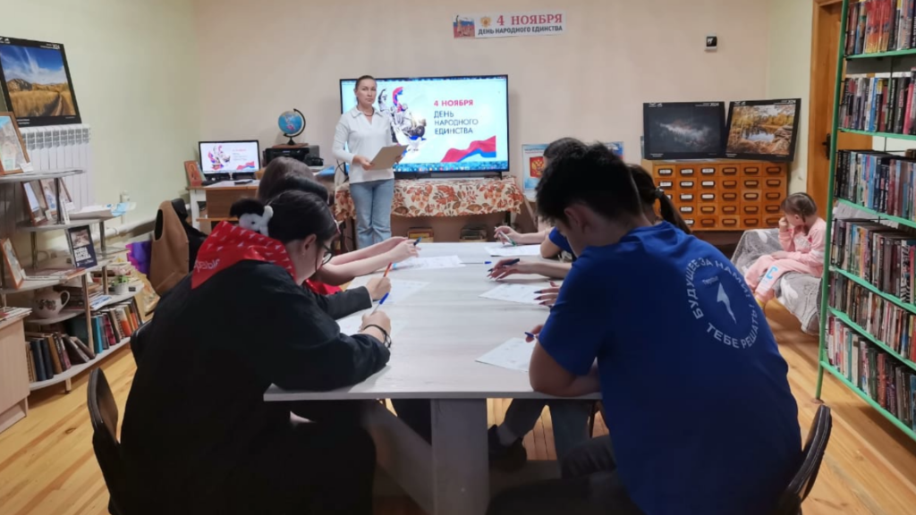 В 2025 году россияне уже в двадцатый раз отмечают День народного единства! В рамках праздничных мероприятий к этому дню Колыванская поселенческая  библиотека приняла участие во Всероссийской детской культурно-просветительской акции “Я – россиянин”,  акция разработана Фондом  поддержки образования ” Ноосфера”,  в формате цифрового анимированного урока и имеет духовно- нравственную и гражданственную направленность. Мероприятие состоялось в совместной работе с ребятами из первичного звена “Движение Первых” – наставник Е.А. Трифонова. Вначале мероприятия  библиотекарь Е.А. Загурских рассказала ребятам, почему 4 ноября стало памятной датой для всей страны и какие исторические события легли в основу этого праздника. Далее участникам был предложен интерактивный фидеофильм о ценностях,  которые помогают людям разных культур жить в мире и согласии,  и объединяют россиян; о четырёх традиционных религиях России и их роли в укреплении взаимного уважения и золотое правило нравственности.  В процессе просмотра участники выполняли интерактивные задания, а ответы  фиксировали в специально разработанных  рабочих тетрадях.  Затем ребята  сформулировали своё понятие, что для них значит быть россиянами, и тоже внесли в тетрадь. Завершилось мероприятие Гимном РФ и общим фото.