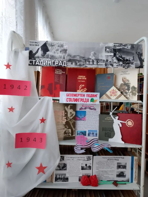 2 февраля 1943 года завершилась двухсот дневная, самая кровопролитная битва за героический город на Волге – Сталинград. В этой величайшей битве второй мировой войны, решилась судьба нашего государства. Мужество и стойкость советских солдат, а также искусство полководцев помогли выстоять и победить в этой не равной битве. К этой дате в Ивановской поселенческой библиотеке была оформлена книжная выставка – память “Бессмертный подвиг Сталинграда”. На выставке читатель может познакомиться с изданиями, в которых раскрываются исторические факты,  о судьбах людей и целой страны, с документальными очерками, воспоминаниями участников тех событий, а также с художественной литературой известных писателей: К. Симоновым “Живые и мёртвые”, Ю. Бондаренко ” Горячий снег”, В. Чуйков “От Сталинграда до Берлина”.