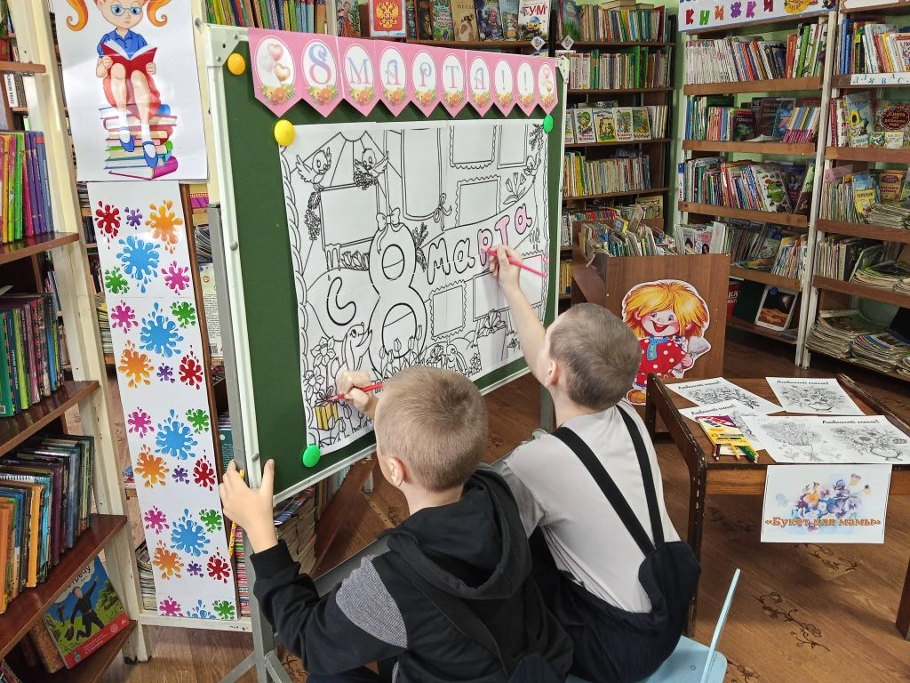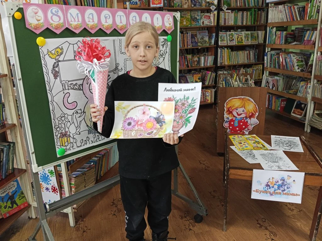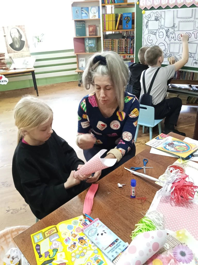 8 марта – очень добрый и радостный день. В этот день мы поздравляем мам, бабушек, девочек с первым весенним праздником. Всем нам хочется удивить и порадовать своих родных и любимых интересным подарком. Конечно лучший подарок – это сделанный своими руками. В преддверии Международного женского дня в Курьинской детской библиотеке для детей и подростков прошел мастер-класс «Букет для мамы ». В течении предпраздничной недели ребята вместе с библиотекарями приняли участие в изготовлении открыток, агамографов, букетов цветов в подарок. Из цветной бумаги при помощи ножниц и клея были изготовлены простые, оригинальные и яркие открытки, в которых ребята написали пожелания своим родным. Кроме того дети приняли участие в создании поздравительной мега- открытки для всех посетителей библиотеки. В течении недели в библиотеке царила предпраздничное настроение, в воздухе витало ощущение весны.