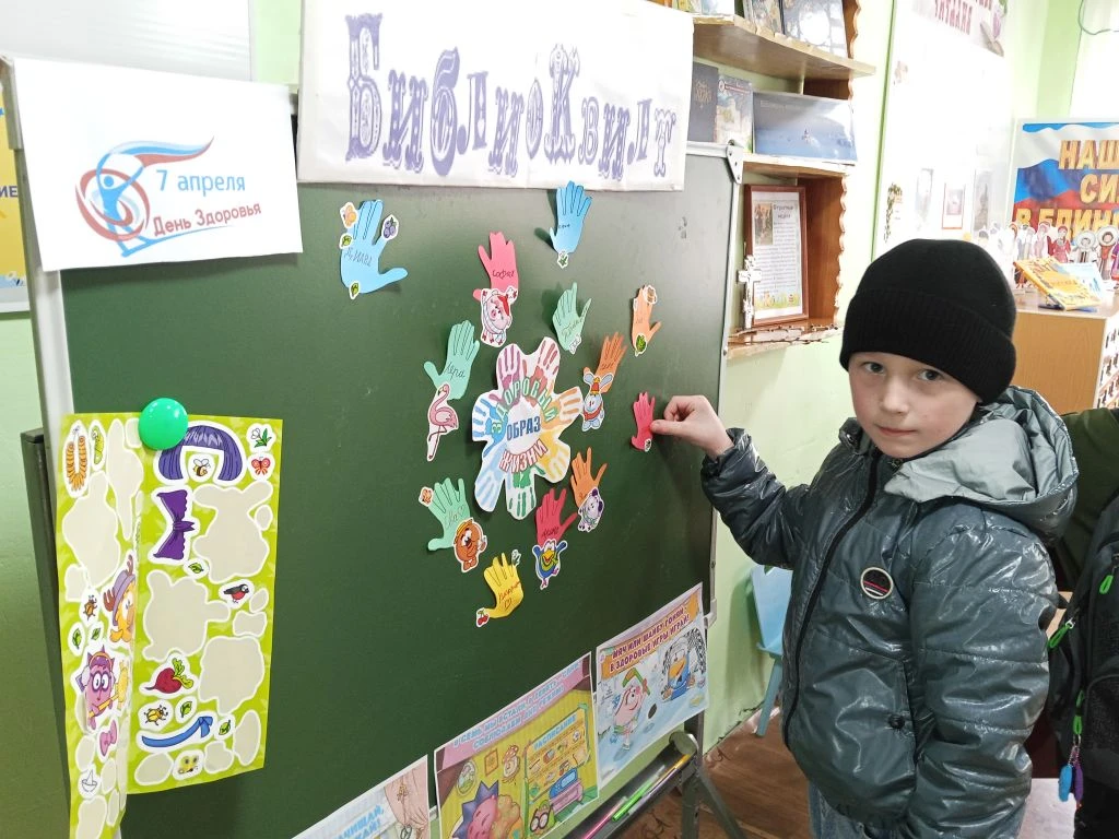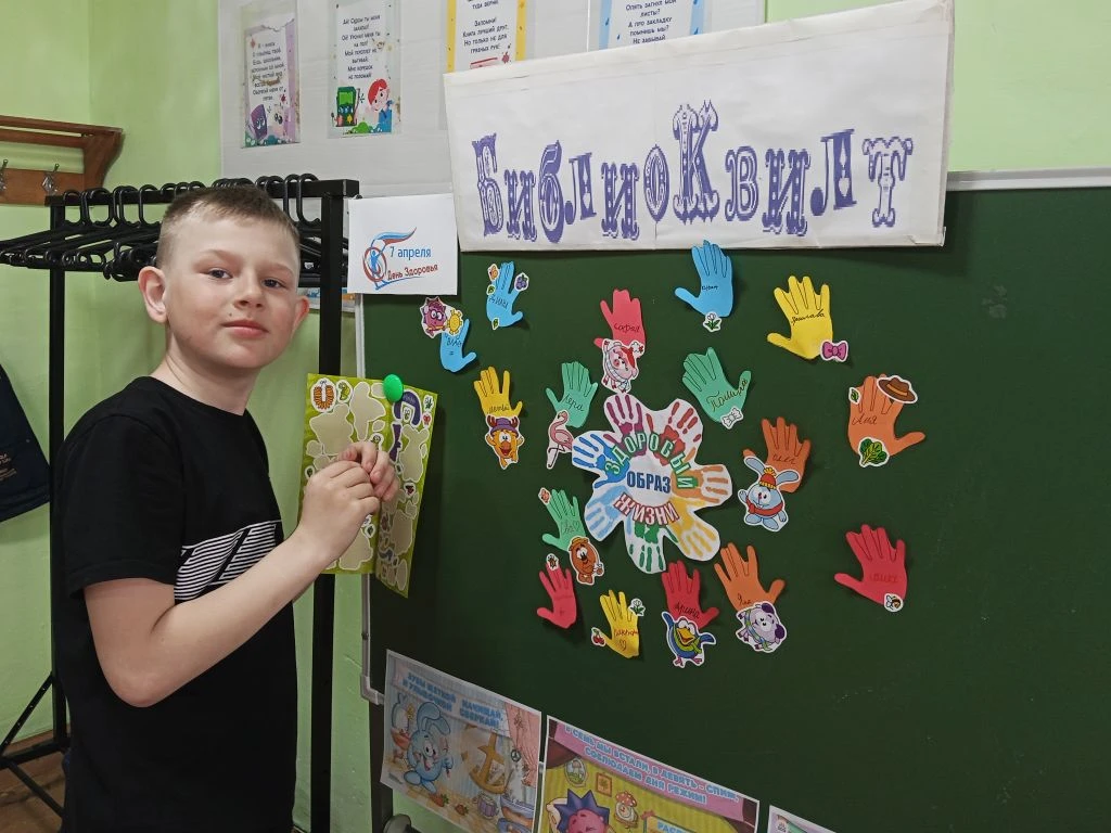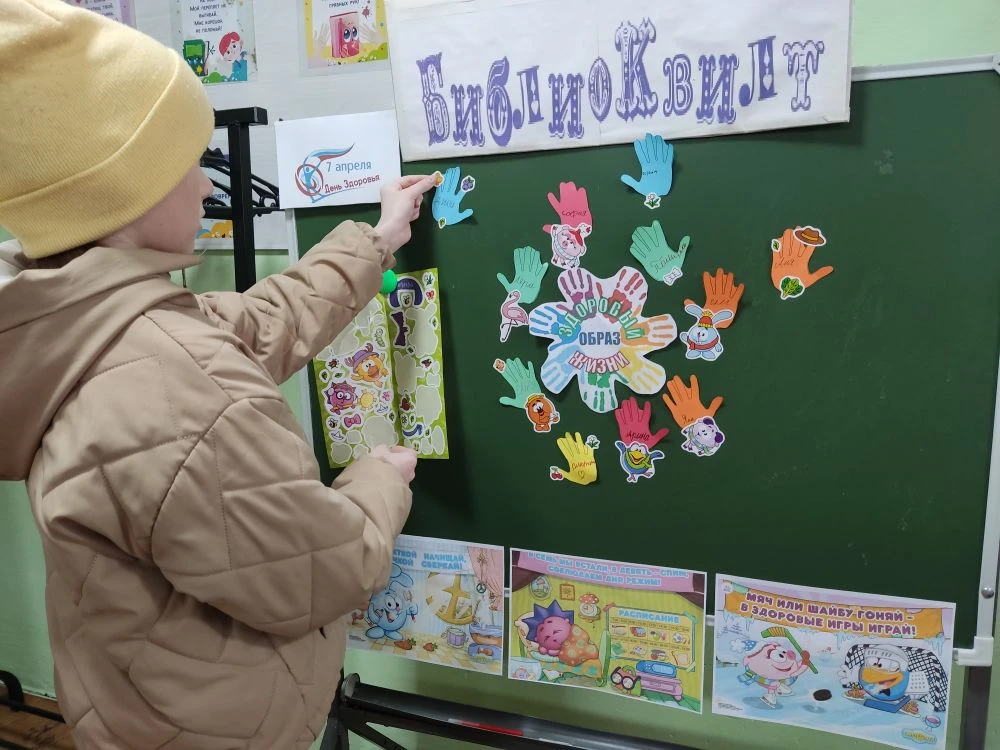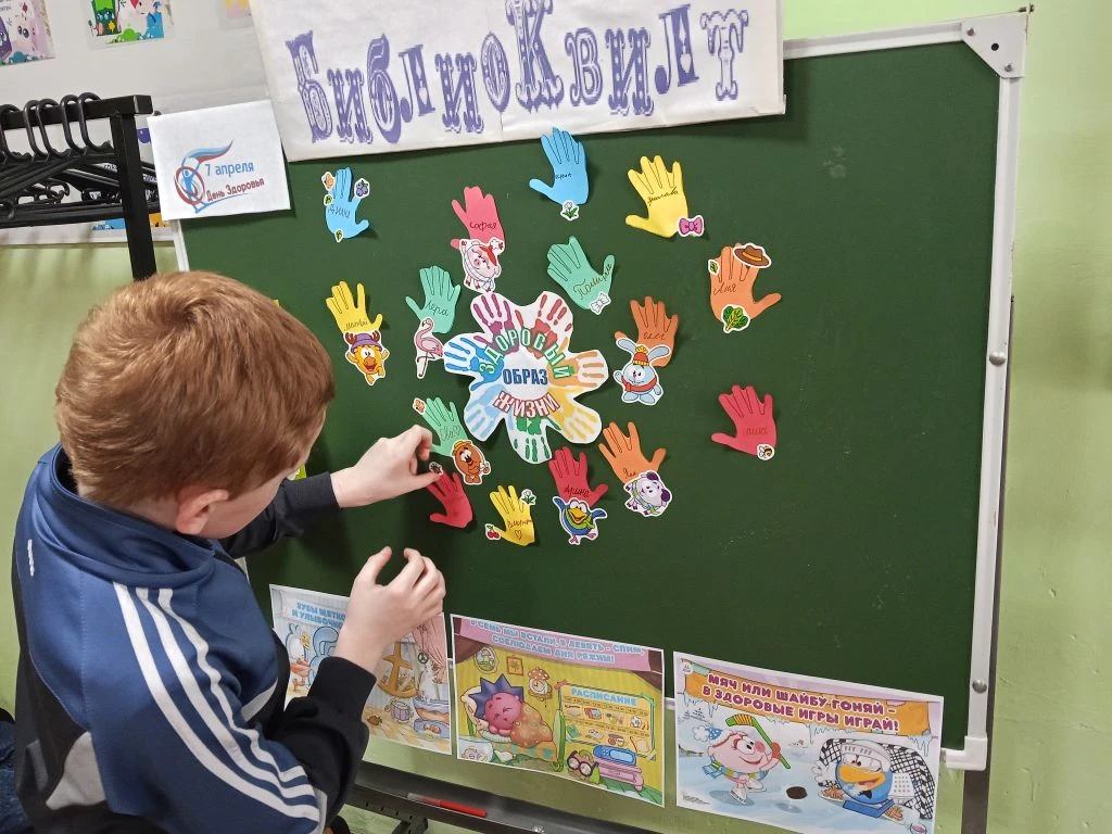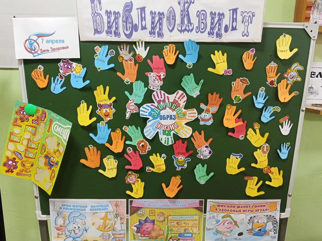 Ежегодно 7 апреля отмечается Всемирный день здоровья. Эту дату выбрали в честь дня создания Всемирной организации здравоохранения в 1948 году. К этой дате в Курьинской детской библиотеке для детей был оформлен библиоквилт «Я – за здоровый образ жизни» и проведен час полезных советов « Новое поколение выбирает здоровье» . Мультипликационные герои Смешарики рассказали ребятам, что для того, чтобы укрепить и сохранить здоровье, необходимо заниматься физкультурой, употреблять полезную пищу, полную витаминов, и не забывать, конечно же, про правила гигиены и режим дня. Ребятам было предложено проголосовать за Здоровый Образ Жизни своими именными ладошками. И вот, что у нас получилось…