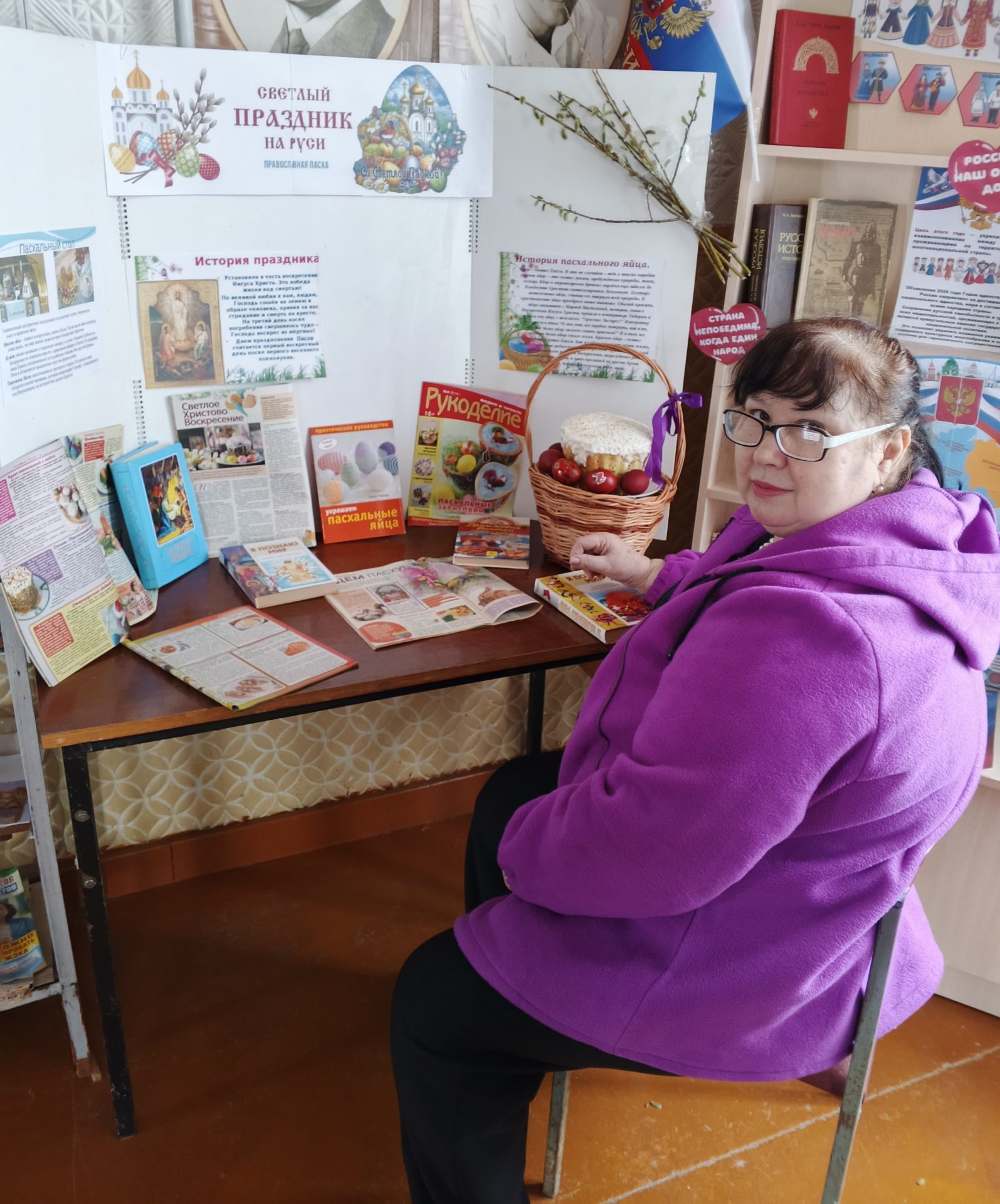 Наряду с книгами об истории и символах празднования Пасхи, о народных традициях и обычаях, представлены пасхальные атрибуты – крашеные яйца, кулич, веточки вербы.