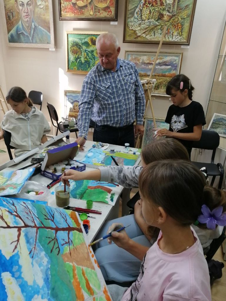 И так как погода не позволила работать на улице, Сергей Михайлович проводил занятия с детьми в здании музея, среди его работ, которые и помогали ему объяснять детям тонкости написания пейзажа. Атмосфера творчества витала в воздухе, ребята вдохновлялись работами художника и с энтузиазмом брались за кисти.
