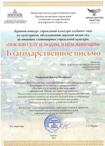 24 сентября творческая делегация Курьинского района приняла участие в третьем зональном этапе краевого конкурса учреждений культуры клубного типа по культурному обслуживанию жителей малых сёл, не имеющих стационарных учреждений культуры «Поклон селу и людям, в нем живущим», который состоялся в п. Степной Третьяковского района.