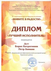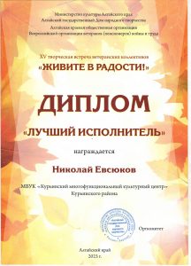 1 октября 2023 года 265 самодеятельных артистов «серебряного возраста» из 16 территорий Алтайского края (Благовещенского, Волчихинского, Завьяловского, Каменского, Крутихинского, Мамонтовского, Ребрихинского, Романовского, Кулундинского, Курьинского, Крутихинского, Михайловского, Первомайского, Табунского, Тюменцевского, Родинского районов и города Яровое) выступали на сцене Родинского районного Дома культуры. Концерт участников творческой встречи прошел в двух отделениях. 23 солиста и 28 коллективов представили разные жанры художественного творчества. Представители нашего района дуэт Б.Батратинин, П.Аникин и солист Н.Евсюков были удостоены Дипломами “Лучший исполнитель”. Поздравляем!