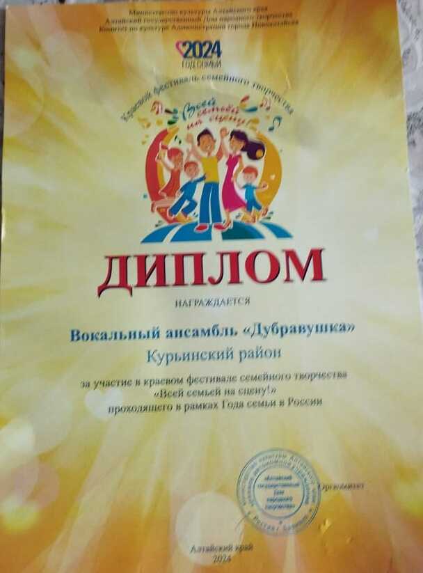 Представителем Курьинкого района стал семейный ансамбль “Дубравушка”, в составе которого выступают 2 поколения семей Борзенковых – Гуниных.
