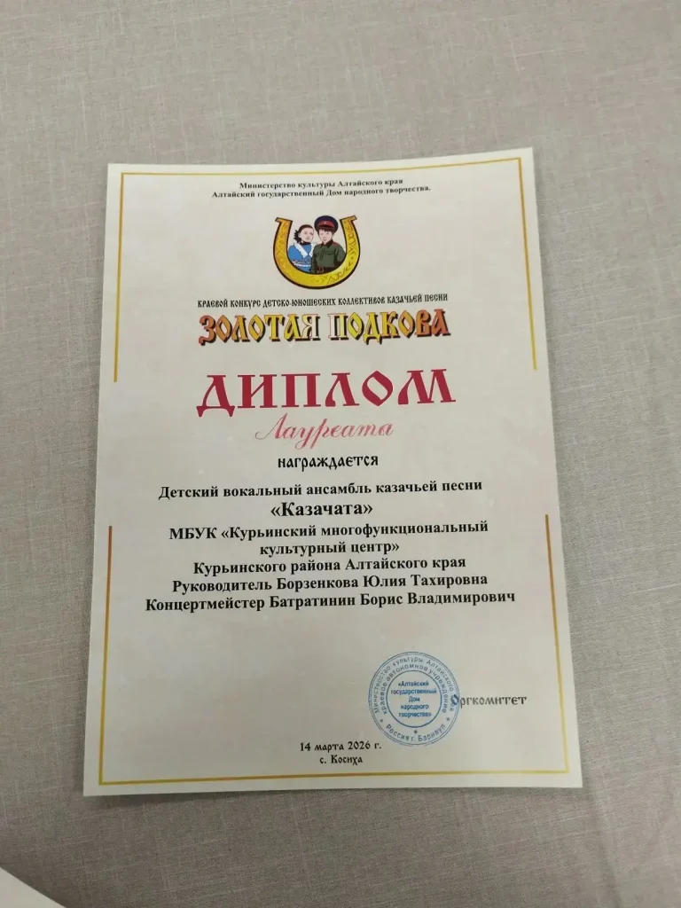 29 марта 2026 года село Косиха стало сценой для Краевого конкурса детско-юношеских коллективов казачьей песни “Золотая подкова”. В этом ярком состязании наш детский Вокальный ансамбль казачьей песни “Казачата”, под чутким руководством Борзенковой Ю. Т. и с виртуозной партией концертмейстера Батратинина Б. В., покорил сердца жюри и слушателей, завоевав Диплом Лауреата. От всей души поздравляем наших юных артистов и желаем им неиссякаемого вдохновения и новых, блистательных побед!