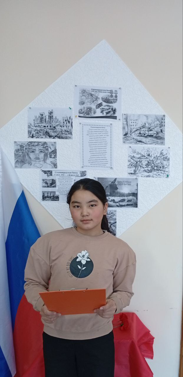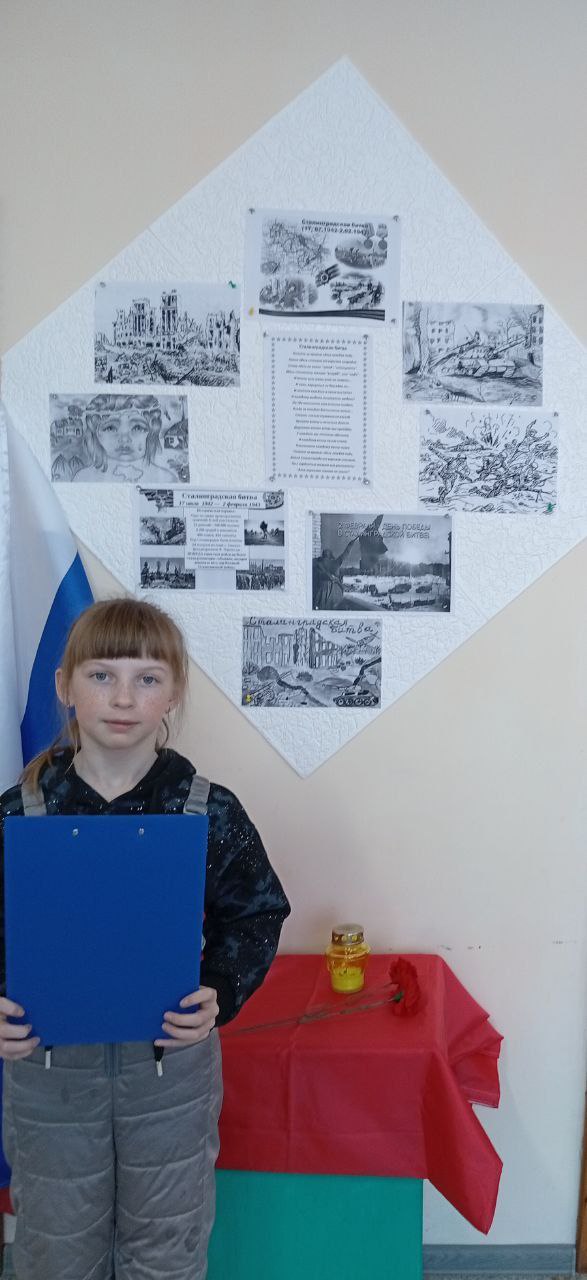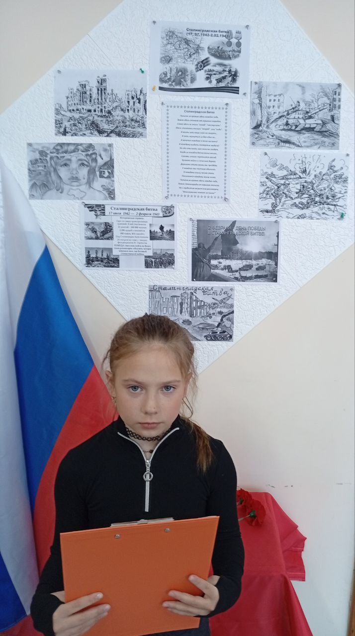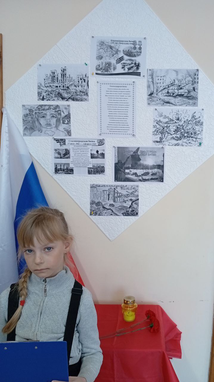час исторической памяти “Вспомним подвиг Сталинграда” ,который позволил ребятам заглянуть в прошлое, в далёкие сороковые – роковые годы и вспомнить имена, героические судьбы тех, кто не отдал ни одной пяди сталинградской земли врагу. Участникам мероприятия рассказали о том, как началось Сталинградское сражение, как немцы стремительно рвались к Волге. Судьба нашей страны висела на волоске. 200 дней и ночей продолжалось противостояние при непрерывно возрастающем напряжении сил обеих сторон. Подвиг защитников Сталинграда яркой звездой будет вечно сиять на страницах истории. Далее была проведена интерактивная викторина «Город мужества и славы» и конкурс чтецов «Памяти Сталинграда посвящается» .В заключении мероприятия провели минуту молчания и зажгли свечи памяти погибшим героям.