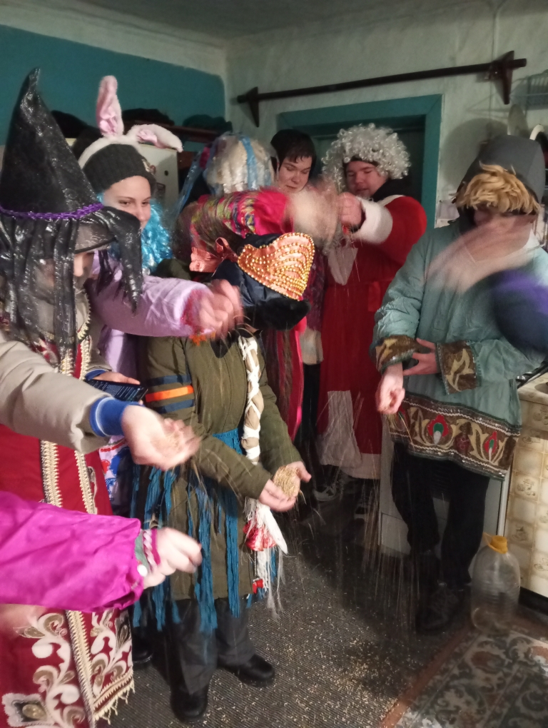 По традиции, мы посыпали зерном в доме у хозяев, а хозяева встречали нас радушно и щедро одаривали сладостями.