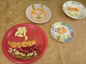 Музыка заиграла – идут по кругу дальше, и так несколько раз пока не закончатся вещи. Побеждает тот, кто более правильно одет. Затем эту компанию нужно сфотографировать. Ещё повеселил конкурс «Чей башмак?» ,участники  (4человека) собираются в круг, снимают обувь и ставят ёё в центр круга. Затем каждому  завязывают платком глаза. Всю обувь перемешивают, после чего участники по сигналу начинают искать свою пару. Кто первым обулся – чемпион. Далее очередное испытание, нужно перемотать клубок ниток, притом танцуя. (звучит песня Т.Буланова «Двигайся ,Таня»,) Ещё участникам предложили проявить себя в мини-спектакле «Очередь за дипломом» и в литературном чтении (письмо Онегина к Татьяне). И в заключение устроили кулинарный конкурс- 2 команды сделали нарезку из фруктов выложили  картинки. Все  участники получили сладкие призы.