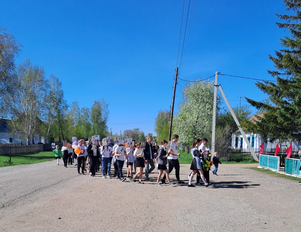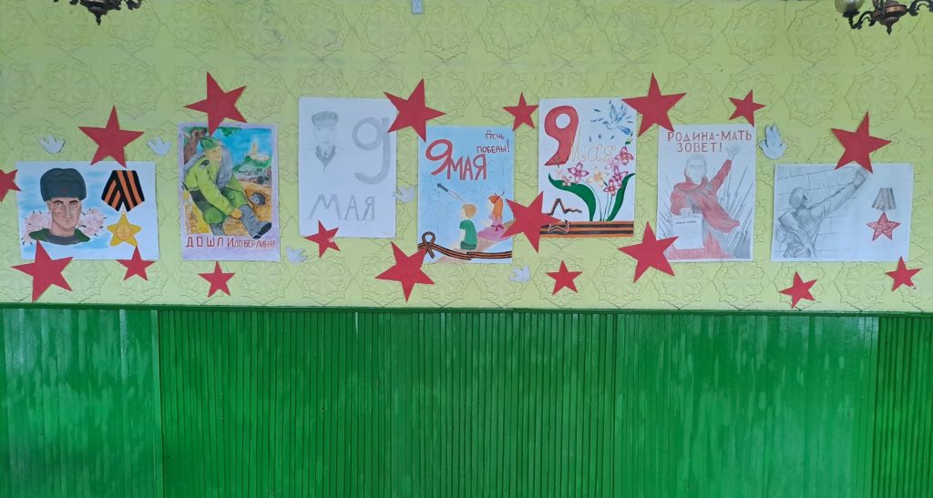 Подготовка  мероприятий  на день  победы  ведется  совместно  с  библиотекой,  школой  и  сельсоветом,  украшаем  площадь  флагами,  а  в  фойе  картины  и  плакаты  нарисованные  детьми. Празднование  9 мая  началось  традиционно  с  9.00,  на  площади  звучали  песни  военных  лет,  жители  села  собирались  на  митинг,  Жанна Сергеевна  провела  акцию  «Георгиевская  лента»  было  приколоно  60 лент. В  10.00  от  школы  началось  шествие  «Бессмертный  полк»,  к  которому  могли  присоединиться все  желающие.  В  10.30  начался  митинг  «Вспомним всех поименно» – в котором  зачитывается  книга  памяти,  выноситься  знамя  победы, дети  читают  стихи, несут  караульную  вахту, и  делают  торжественное возложение цветов к обелиску. Митинг  заканчивается  минутой  молчания.   Далее  мероприятие  продолжается  в  зрительном  зале.  К  этом  году  была  представлена  концертная  программа   «Великий свет ПОБЕДЫ!»,  в  которой  приняли  участие  26 человек.  9 мая  самый  многочисленный  праздник,  а это  значит что  наши  жители помнят и  чтут  своих  героев.