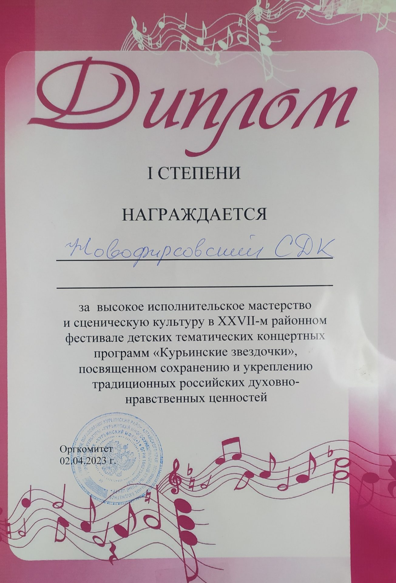 2 апреля Новофирсовский СДК принял участие в районном конкурсе «Курьинские звёздочки – 2023», посвящённом сохранению и укреплению традиционных российских духовно – нравственных ценностей. Всего заявлено было семь детских музыкально – тематических программ. Наша называлась «Люблю тебя, моя Россия!». Первым номером было выступление Долгих Алины с песней «Сторонка русская». Далее танцевальная группа «Серпантин» представила вниманию зрителей новый танец под названием «Свидание». А заключительным номером Долгих Жанна исполнила художественное чтение «Любите Россию!». В районном конкурсе наши звёздочки были награждены дипломом первой степени.