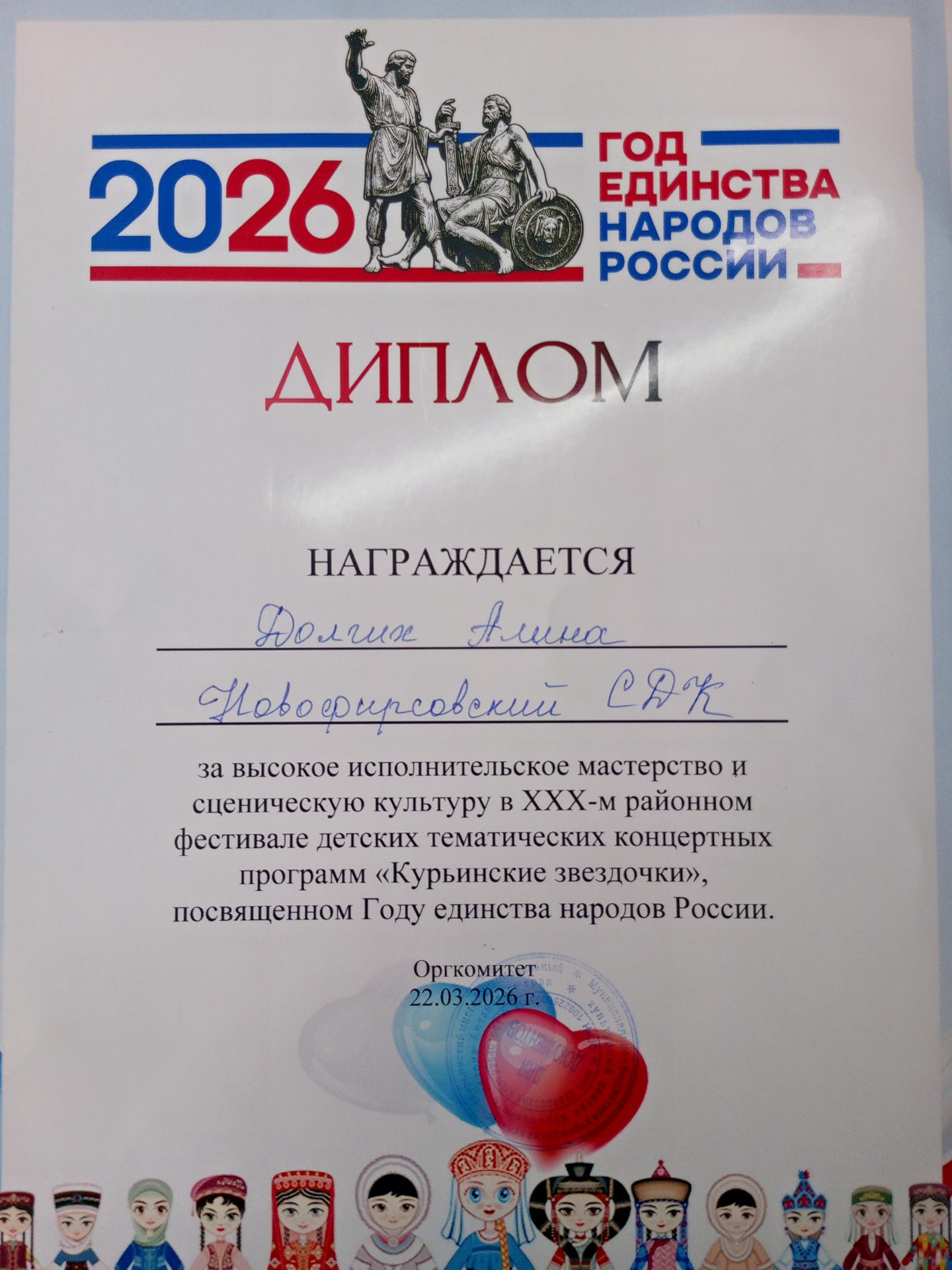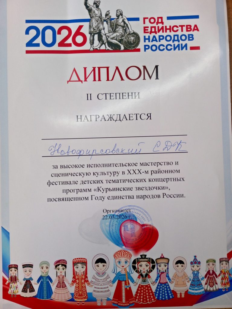 22 марта в 12:00 ч. в районном Дворце культуры состоялся ежегодный юбилейный ХХХ районный фестиваль детских тематических концертных программ «Курьинские звёздочки», посвящённый Году единства народов России. В данном мероприятии приняли участие 8 сельских домов культуры. Новофирсовский СДК представил музыкально – тематическую программу «Под небом единым народы России». В начале выступления дети читали стихи о единстве России. Песня «Я-Россия, ты-Россия» в исполнении Долгих Алины никого не оставила равнодушным. На протяжении всей песни зрители поддерживали своими громкими аплодисментами. Танец с флагами «Мы единая страна» в исполнении танцевальной группы «Серпантин» тронуло зрителей до глубины души. Очень проникновенно и трогательно Долгих Жанна исполнила художественное чтение «Дружба народов». По итогам фестиваля Новофирсовский СДК за высокое исполнительское мастерство и сценическую культуру награждён дипломом II степени и диплом, за исполнения песни получила Долгих Алина. Фестиваль завершился, но дружба между народами пусть никогда не кончается! Всегда нужно помнить о том, что какой бы мы с вами не были национальности все мы – жители огромной страны, мы – россияне!