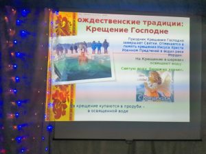 Была проведена Викторина “Крещение Господне” она состояла из 5 вопросов на которые гости с удовольствием отвечали, прослушали музыкальные композиции которые были написаны к этому празднику. Артисты художественной самодеятельности предоставили несколько музыкальных номеров которыми поздравили гостей.