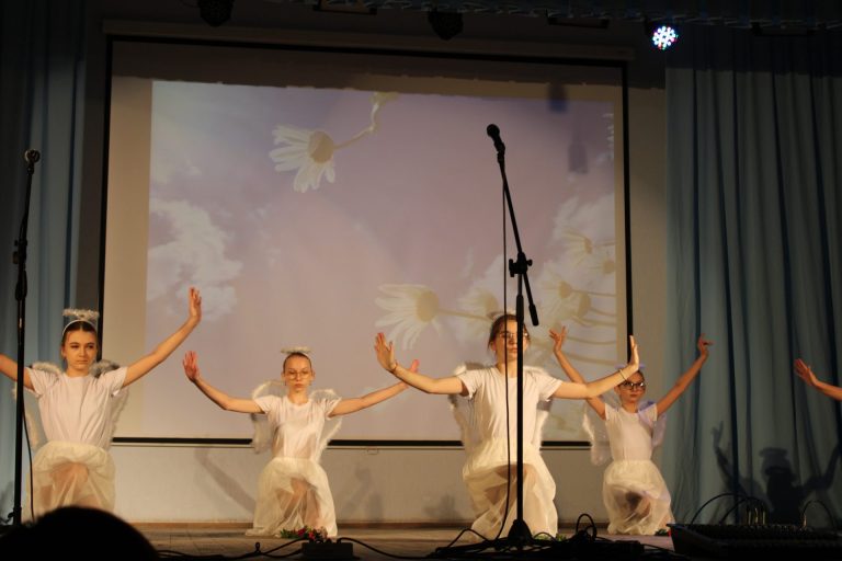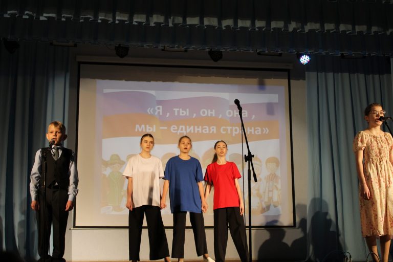 Танцевальный коллектив «Непоседы» показал свой танец, который назывался «Ангелы», Минин Глеб и Юшкова Екатерина исполнили песню «Едины мы», а Лютц Наталья прочитала два стихотворения про Россию.