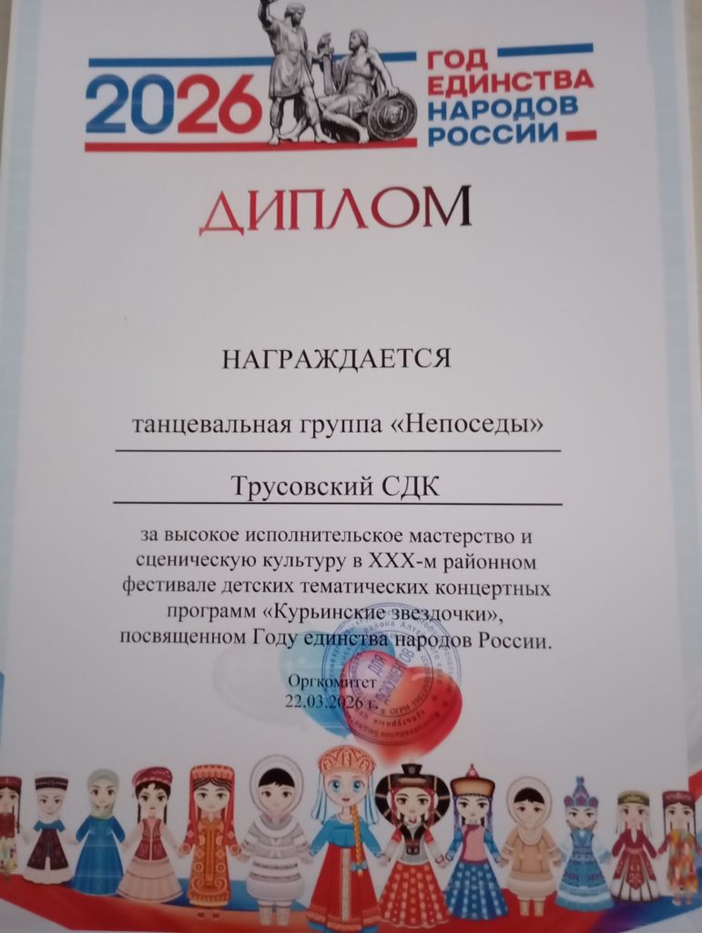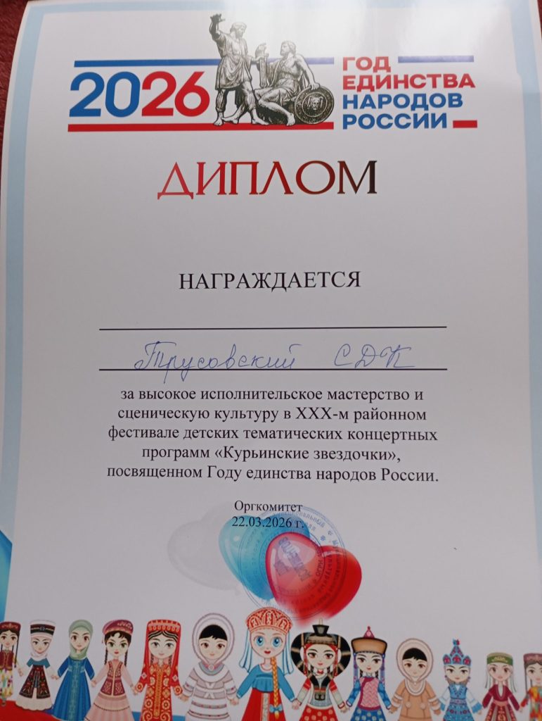 22 марта Трусовский СДК принял участие в XXX районном фестивале детских тематических программ «Курьинские звёздочки». Дети села представили программу, которая называлась «Едины мы».