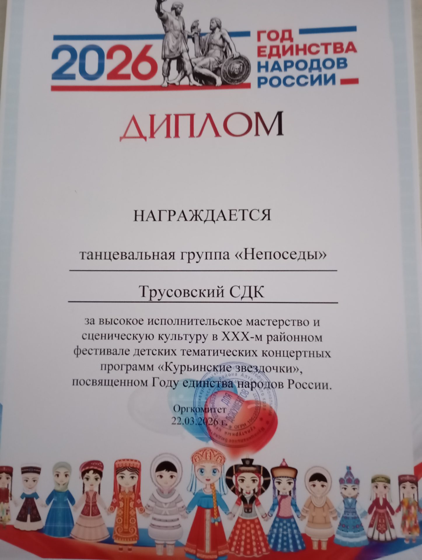 По итогам Трусовский СДК был награждён дипломом за участие, а танцевальную группу «Непоседы» отметили специальным дипломом за высокое исполнительское мастерство.