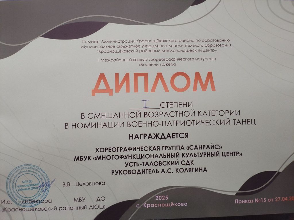 Этот успех стал заслуженным признанием таланта и трудолюбия участников коллектива, а также профессионализма руководителя А.С. Колягиной, чей вклад в развитие хореографического искусства в районе трудно переоценить. Победа в конкурсе “Весенний джем” не только укрепила позиции “Санрайс” как одного из ведущих танцевальных коллективов Курьинского района, но и стала стимулом для дальнейшего творческого роста и новых достижений. Безусловно, этот триумф войдет в историю Усть-Таловского СДК и всего района как пример вдохновляющего стремления к совершенству в искусстве.