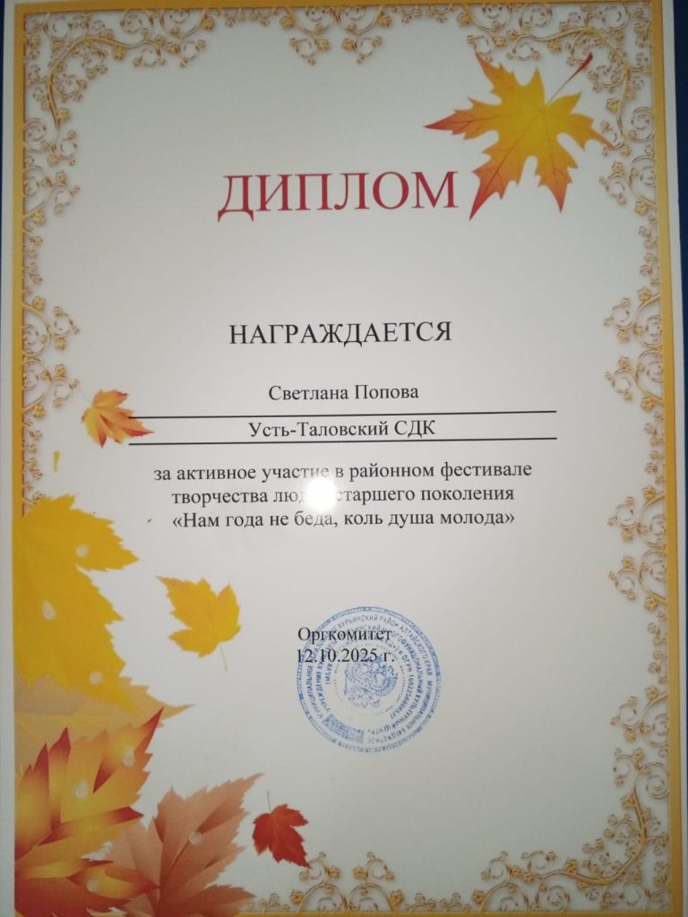 12 октября в Курьинском дворце культуры и искусств, прошел четвертый районный фестиваль творчества пожилых людей «Нам года не беда, коль душа молода!» От нашего Усть-Таловского СДК, приняли участие в концертной программе ансамбль русской песни «Гармония», они уже не первый год участвуют в поздравлении ко Дню пожилого человека.